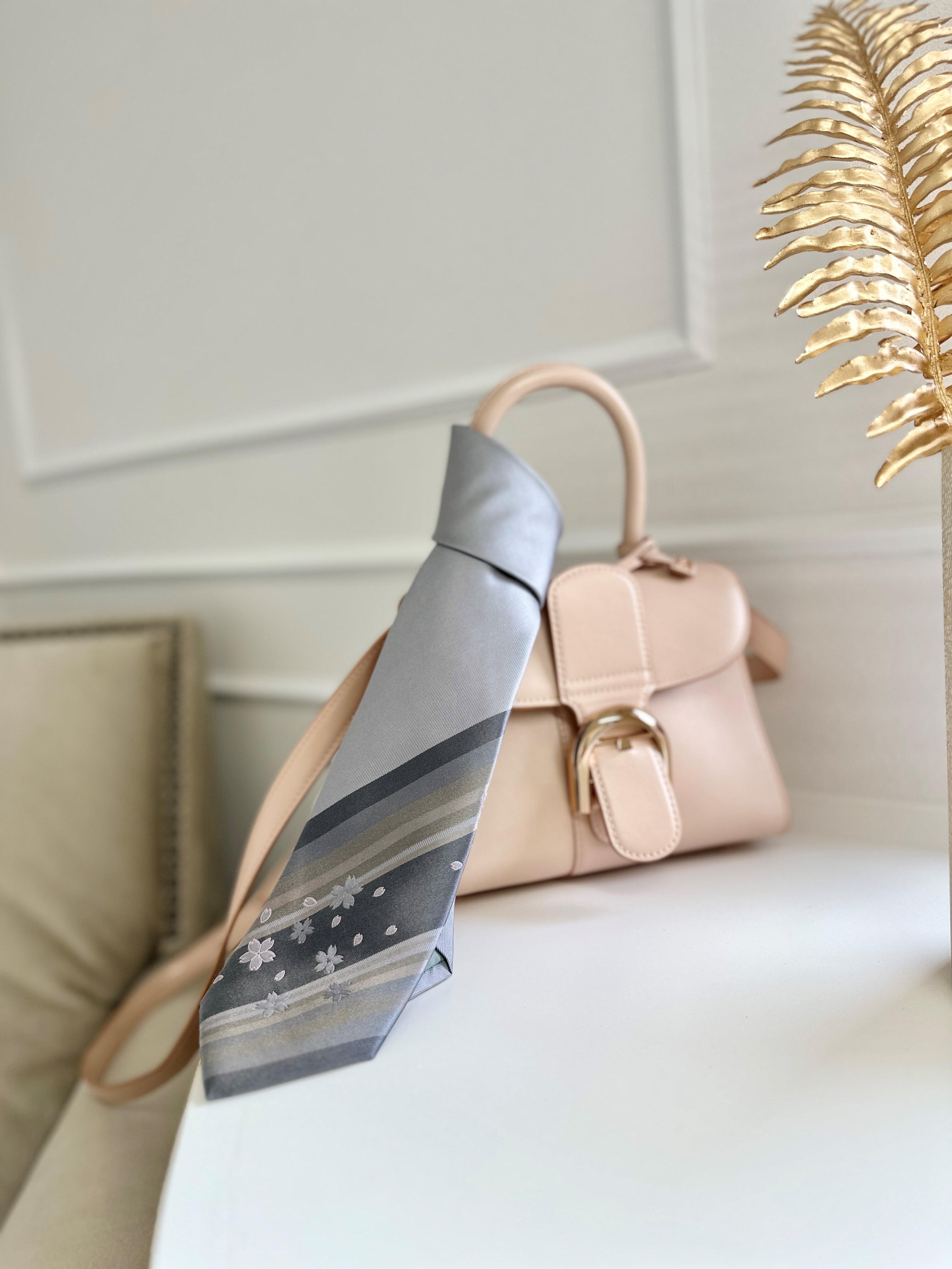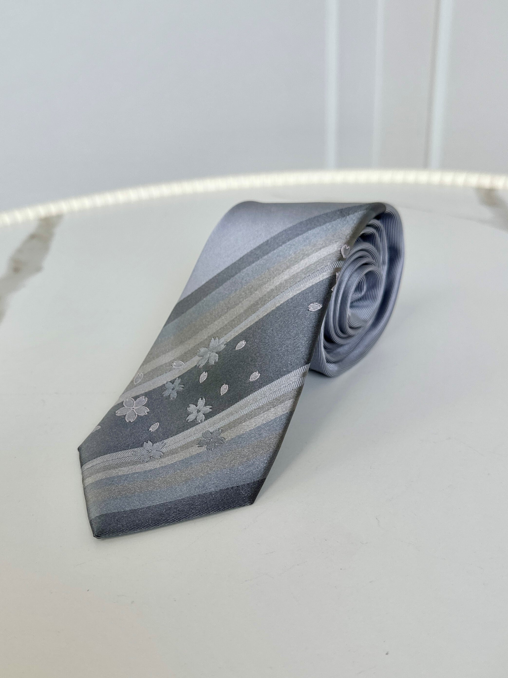 macoto.kamimoto がこよなく愛する〈さくら〉がモダンでセンスよく描かれている洗練された大人の男性をイメージして仕上げられたシルクツイルネクタイです。
